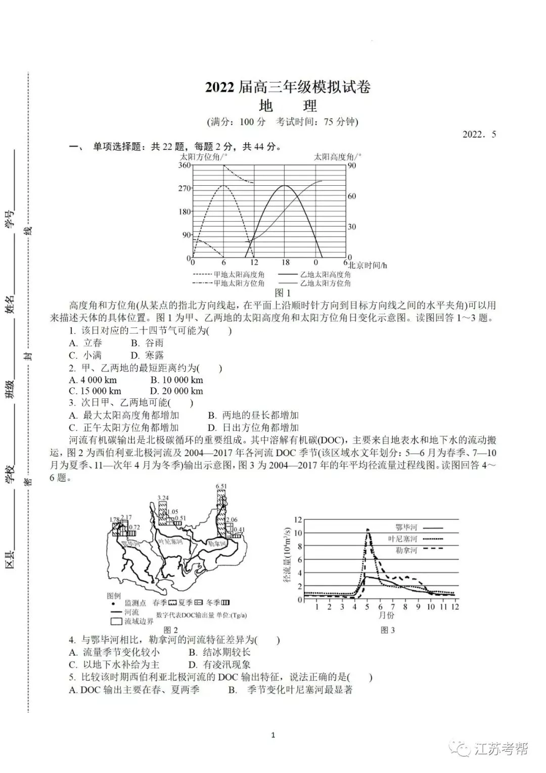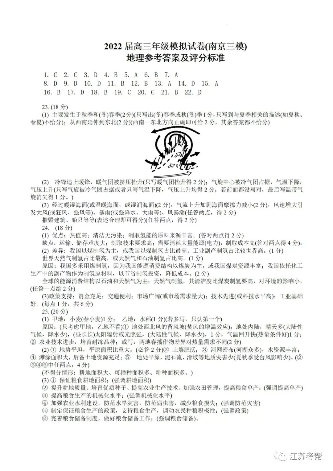 江苏南京市2022届高三年级5月三模地理试题及参考答案