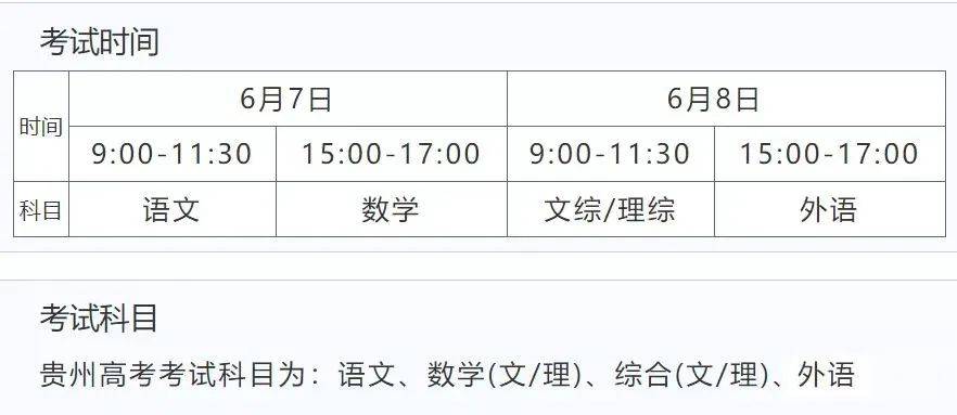 2022年贵州高考时间是6月7日—8日,具体时间安排如下: