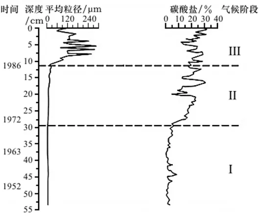 杞麓湖位于云贵高原,为封闭型断层陷落湖盆,无明显的地表径流出口。沿湖平原是当地重要的农耕区。下图为杞麓湖某采样点部分时段沉积物平均粒径、碳酸盐含量的变化曲线图。该湖泊沉积物的粒径及其碳酸盐含量与湖泊水位呈显著负相关。据此完成下面小题。