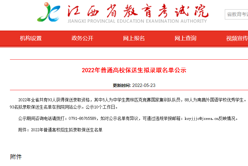 2022年全省共有93人获得保送录取资格,其中5人为中学生奥林匹克竞赛国家集训队队员,88人为南昌外国语学校优秀学生。现将93名拟录取保送生名单在我院网站公示。公示10个工作日。