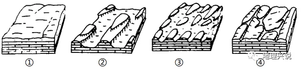 13.风蚀雅丹的形成过程:在长期的地质风化作用下,风和流水可以带走疏松的沙土层,荒漠区变化剧烈的温差所产生的胀缩效应能够让坚硬的泥岩层发生崩裂,暴露出来的沙石层被水和风带走,逐渐演变为凹槽状。再加上雨雪水的冲刷作用使得崩裂的裂隙加宽扩大,大风对裂隙不断进行剥蚀,沙土层慢慢形成风蚀沟谷和洼地,被留下来的坚硬的岩石则形成孤岛状的、大小不一的长条形土墩,按照这一形成过程对照①②③④四幅图,其演变过程为①④③②,B正确。其他选项内的排列顺序与风蚀雅丹的形成过程不符,A、C、D错误。故选B。