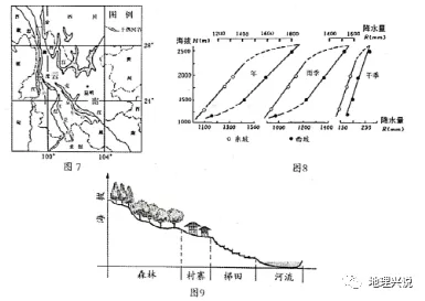 (3)根据材料,在云南南部澜沧江、红河流域之间的哀牢山、无量山等山区,分布着哈尼族的村寨和梯田。说明村寨位于低纬度地区,热量条件较好;根据图9信息,村寨位于山地的山腰地区,位于森林下方、梯田上方,水质优良,气温适中;靠近森林、梯田,方便人们下山耕种,上山获取生活资料;根据材料,横断山区地处湿润地区,但多干热河谷。河谷地带的气候过于干热,蒸发旺盛,地表缺水,不适合聚落分布;横断山区,地势起伏大,山高谷深,多V河床,河谷谷底平地少,不适合聚落分布;河流水的蒸发和植物蒸腾带来丰富的水汽,受地形抬升,在半山腰多山地降水,山腰地表水源丰富,有利于聚落的分布。