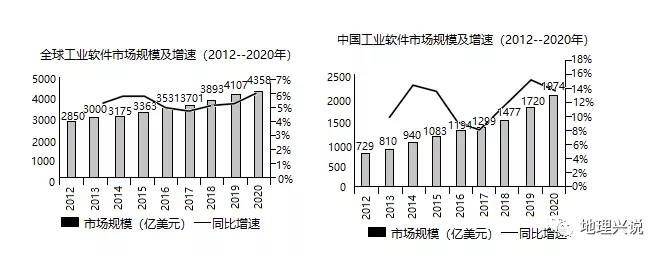 (2)本题要根据图来分析。读图可知,到2020年我国工业软件市场规模接近2000亿美元,工业软件市场大;表示工业软件市场规模的立体住越来越高,说明工业软件市场规模在逐年上升;从同比增速折线也可以看出我国工业软件市场增速高于全球增速,说明国产软件在高端市场占比小。
