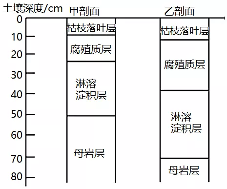 (2)乙土壤剖面。该地降水少、集中在夏季,且蒸发量大,阴坡气温低,蒸发量小,水分条件好,生物量大,水分下渗多,土壤剖面的腐殖质层和淋溶淀积层比阳坡厚。(或由图可知,阴坡土壤有机碳含量高,说明阴坡植被条件好,对应的土壤剖面枯枝落叶层和腐殖质层厚。)