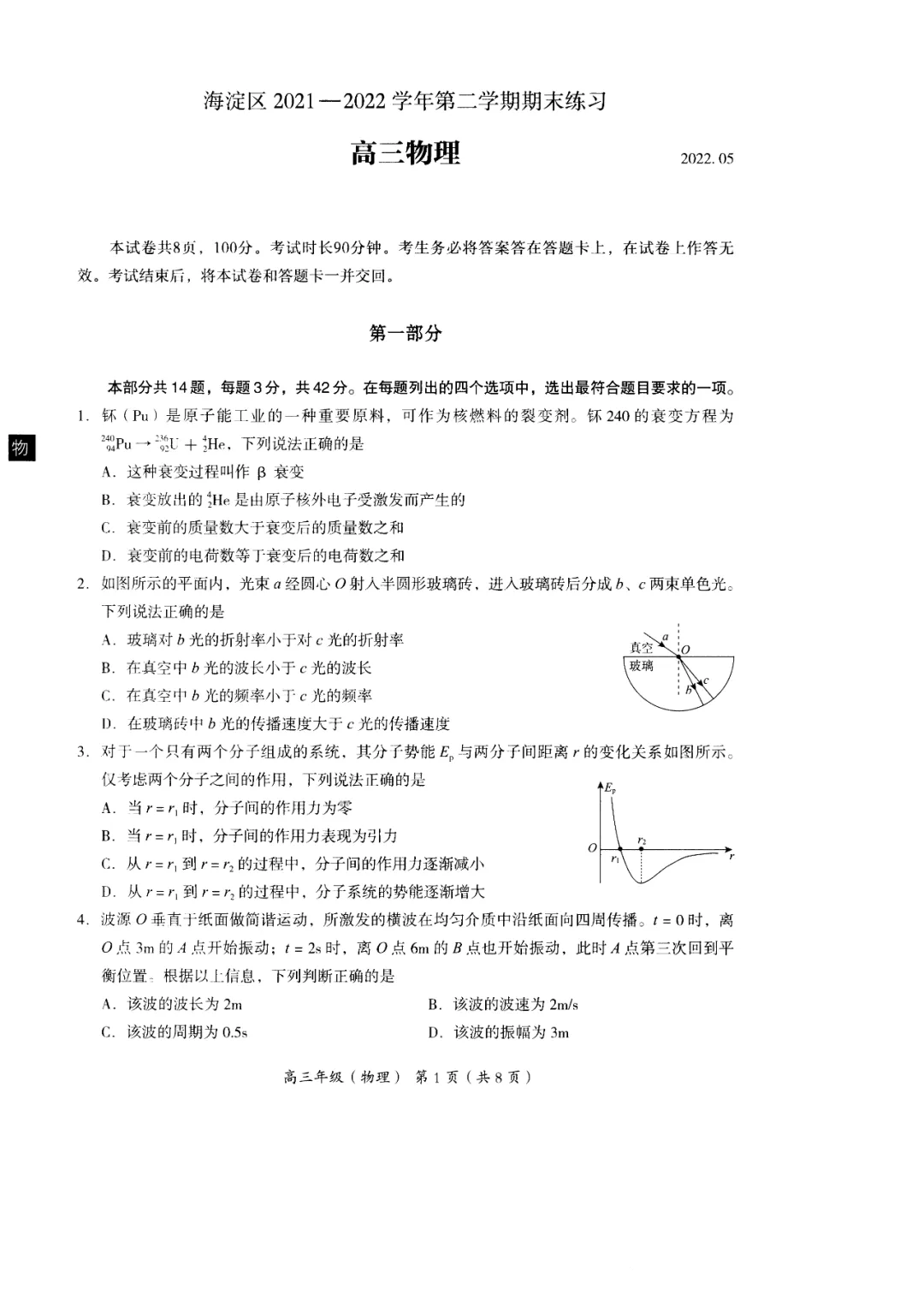 北京清华附中2021-2022学年高一下学期期末物理试卷及答案
