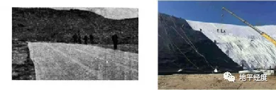 自20世纪90年代以来,受全球气候变暖的影响,我国冰川呈现全面、加速退缩的趋势。2020年8月5日~10月17日,我国科研人员在青藏高原东南部边缘的达古冰川进行人工干预减缓冰川消融试验,即在冰川表面铺设反光和隔热材料——土工织物(如图6所示)。试验结果表明试验区域的冰川消融速率显著低于无土工织物覆盖的非试验区域,减少1立方米的冰川消融需要5元左右覆盖成本的投入,土工织物无法再循环利用。