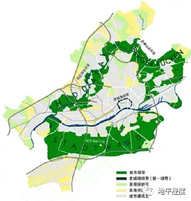 法兰克福是德国黑森州最大城市,面积248.3km2。城市现有两条绿带,第一绿带是1806年原中世纪星形防御城墙拆除后改建的市民公共绿地(1827年立法保护该地区永不被建设侵占);另一条是环绕中心城区的城市绿带,始建于1992年,绿带建设采取长期大量小型子项目的渐进式"慢营建"策略,总体实施期限50年。图3示意法兰克福绿带在城市中的位置。据此完成8~9题。