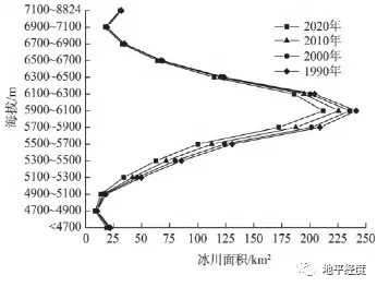 朋曲流域(27°49'~29°05'N,85°38'~88°57'E)位于青藏高原南缘,大部分位于喜马拉雅山脉北侧,平均海拔4500m,流域内发育了大量冰川。近年来在全球气候变化影响下,朋曲流域冰川分布面积变化显著。图4示意1990~2020年朋曲流域不同海拔高度冰川分布面积。据此完成10~12题。