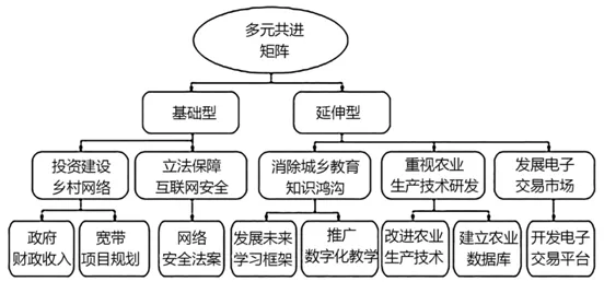 美国农业数字化起步较早,在进行数字乡村的建设过程中美国选择了较为系统化的多元共进矩阵型发展模式,直接从农业信息技术应用、农业信息网络建设、农业信息资源开发利用等技术层面全方位推进数字乡村建设。具体发展模式如下图所示。据此完成下面小题。
