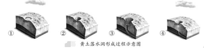 在陕北黄土高原,在一道黄土墚靠近冲沟的边缘地区,平坦的墚面上突然出现了一个巨大的塌陷,颇似一个“大脚印天坑”,这个大坑并非天坑,而是一个黄土落水洞。一般分布在沟谷两岸的地表水与地下水转换较快的部位。下图示意黄土落水洞形成过程。据此完成下面小题。