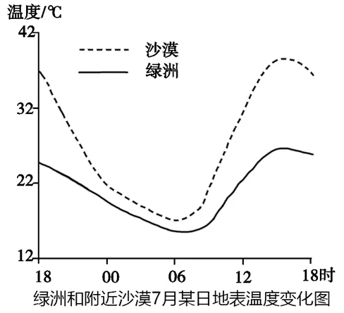 “绿洲冷岛效应”指干旱地区的绿洲区域,夏季气温比附近沙漠、戈壁低,湿度比周边大的特殊气象效应。兰州高原大气物理研究所的科研人员对河西走廊的某绿洲和沙漠的气温观测发现,在7-8月天气稳定的状态下,会出现“绿洲冷岛效应”。下图示意该绿洲和附近沙漠7月某日地表温度的变化。据此完成下面小题。