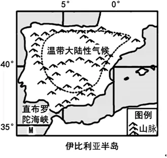 伊比利亚半岛(如下图)海岸线较平直,半岛中东部的高原山地发现了许多未受侵蚀的史前壁(岩)画,壁(岩)画一部分在露天的岩石上,更多在洞窟中。半岛西南部有沿海低地平原,人口分布较多,南面隔直布罗陀海峡与非洲大陆相望,海峡最窄处宽约13千米,最浅处水深301米,最深处水深1181米。半岛南部海域分布有世界著名渔场M。据此完成下面小题。
