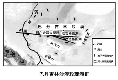 在我国内陆干旱、半干旱地区,有一类特殊而罕见的湖泊,其湖面有时呈现出奇特的粉红色,这类湖泊被称为“玫瑰湖”,是一种季节性的“赤水”景观(受水温、盐度、水量等因素影响,含有红色色素的卤虫、藻类等生物大量繁衍)。巴丹吉林沙漠有中国分布最密集的“玫瑰湖”群,这些玫瑰湖以白色盐碱“打底”,众多酒红色的斑块点缀其间,浑然天成。每年都有一段时间,从高空看,达格图湖就像一块镶嵌在黄沙上的“粉红宝石”,在阳光照耀下闪烁出迷人光泽。下图为巴丹吉林沙漠玫瑰湖群分布。