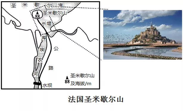 (2)为开发旅游业,人工建设长堤与大陆相连,阻挡了海水的运动,海水流速降低;使圣米歇尔湾沉积作用加速,沉积物增多,导致圣米歇尔湾加速萎缩。
