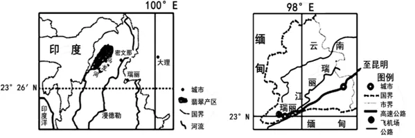 世界上90%以上的翡翠(如下右图)产自缅甸,也叫缅甸玉,缅甸90%以上的优质翡翠大多来自缅甸北部的乌龙河流域第四纪和第三纪砾岩层次生翡翠矿床中。翡翠原料开采和加工成为当地的主导产业及缅甸政府外汇的主要来源。早期主要靠人工在河床上采集翡翠石料,其中翡翠原石的80%以上出口中国。云南瑞丽是中国重要的翡翠加工基地之一,现已经成为享誉海内外的“东方珠宝城”。但近年来,随着无数有实力的珠宝公司进驻缅甸,当地实现了大型机械化开采,缅甸政府对于翡翠原石的出口做出了限制。下左图为缅甸翡翠主产区分布图。下右图为云南瑞丽区位分布图。