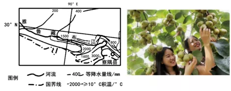察隅县位于西藏自治区东南部,总面积31659平方公里,总人口3.3万余人,民俗文化多样,民情特殊,属全区深度贫困县之一。为脱贫致富,当地政府为农牧民引种有机红心猕猴桃(也称奇异果,原产于我国南方地区)。2011年开始规模种植(下右图),种植区地处亚热带湿润山区河谷台地,黑色沙壤土广布。2017年“察隅猕猴桃”获批国家农产品保护标志。察隅猕猴桃挂果期长,可错峰上市。猕猴桃种植带动了当地农牧民脱贫。下左图为察隅县区位示意图。