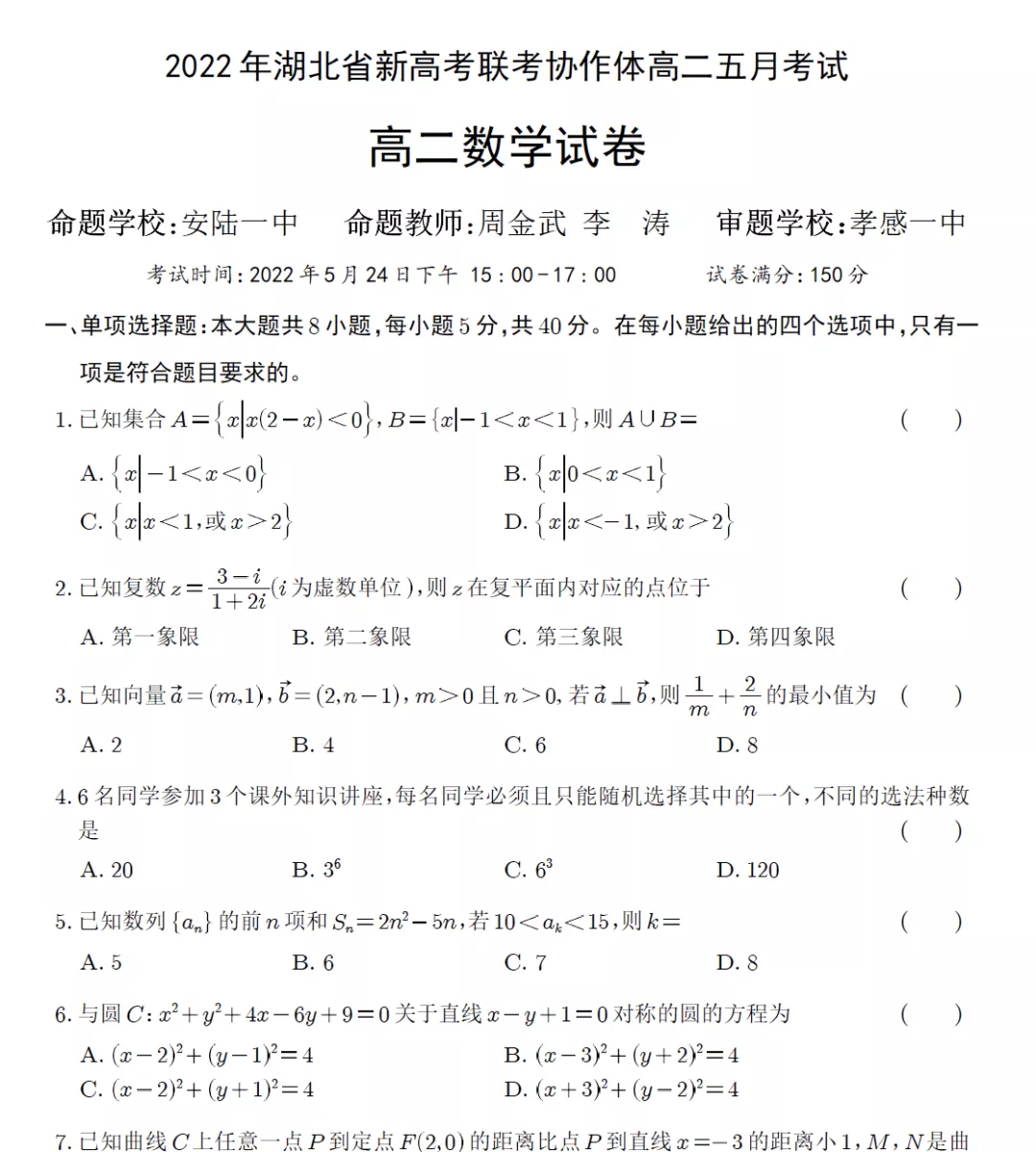 2022湖北省新高考联考协作体高二五月考试·数学