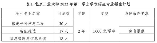 学校2022年招收全日制普通第二学士学位学生的专业为微电子科学与工程、智能建造、信息管理与信息系统。报考微电子科学与工程专业的考生,本科所获学士学位所属专业类不能为电子信息类;报考智能建造专业的考生,本科所获学士学位的专业类不能为土木类;报考信息管理与信息系统专业的考生,本科所获学士学位的专业类不能为管理科学与工程类。各专业招生计划分配情况如表1所示(最终招生计划以北京市教育委员会批准为准)。