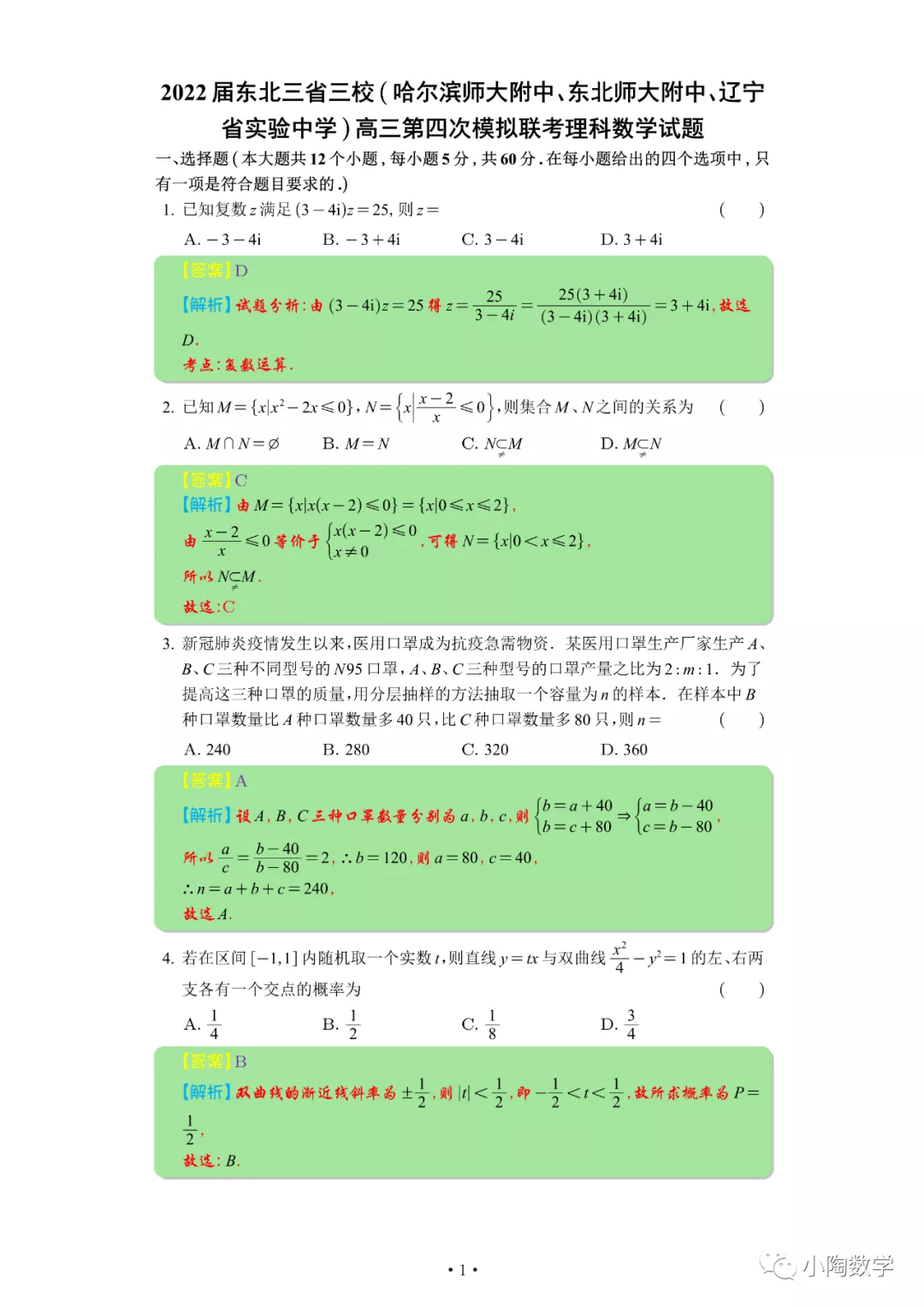 2022届东北三省三校(哈尔滨师大附中、东北师大附中、辽宁省实验中学)高三第四次模拟联考理科数学试卷和答案