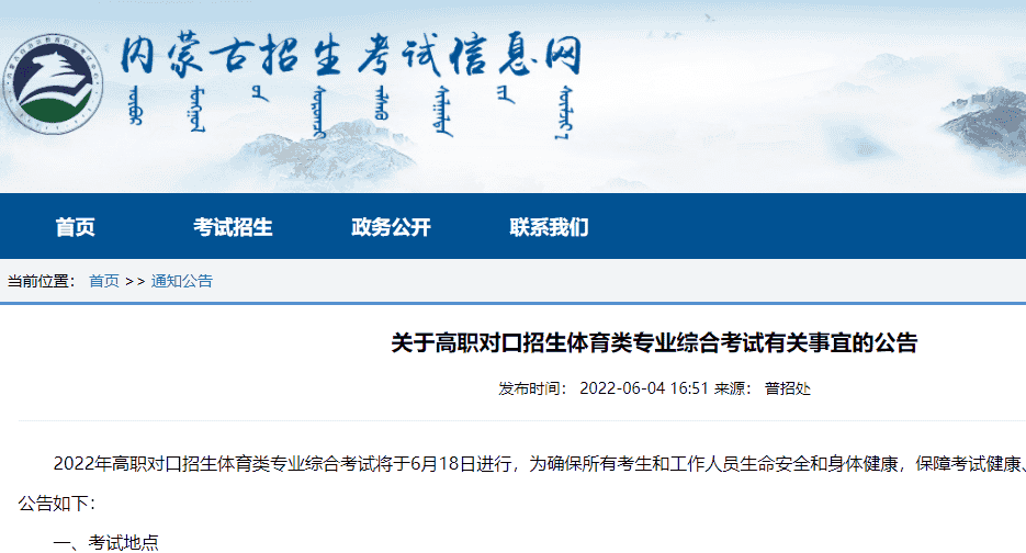 2022年内蒙古高职对口招生体育类专业综合考试时间:6月18日