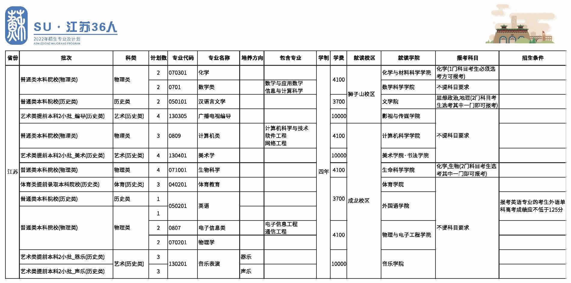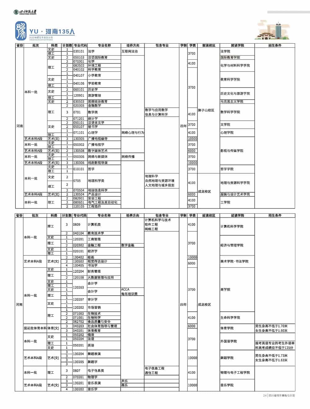2022年四川师范大学在山东招生计划中法学专业招生2人、汉语国际教育专业招生2人,在江苏招生计划中化学专业招生2人、数学类专业招生2人,在河南招生计划中法学专业招生2人、汉语国际教育专业招生2人。