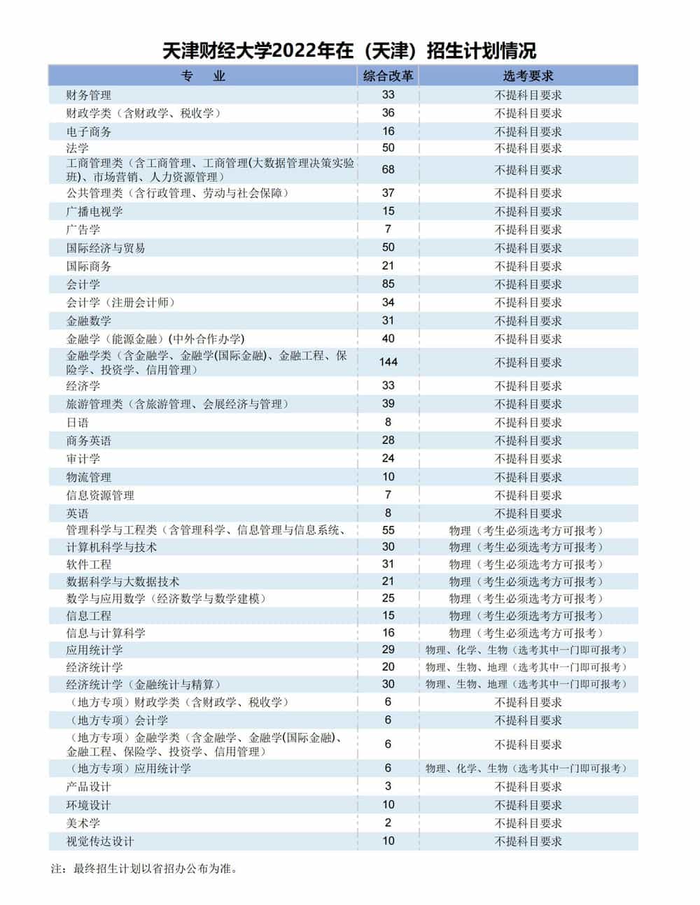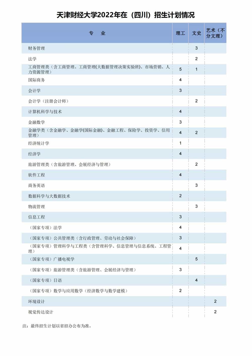 2022年天津财经大学在天津招生计划中法学专业招生50人、财务管理专业招生33人,在浙江招生计划中广告学专业招生3人、国际商务专业招生4人,在四川招生计划中法学专业招生2人、财务管理专业招生3人。