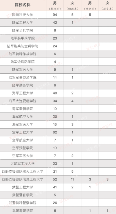2022年国防科技大学在辽宁招生人数物理94人、女5人;陆军工程大学在辽宁招生人数中物理男42人;陆军装甲兵学院在辽宁招生人数物理男6人。