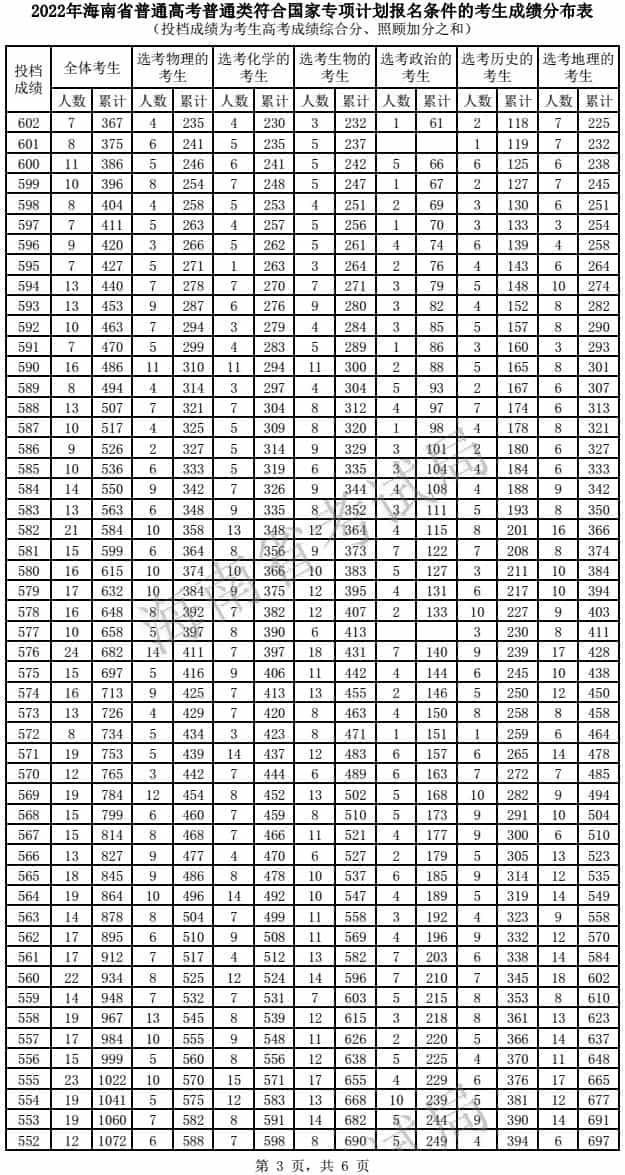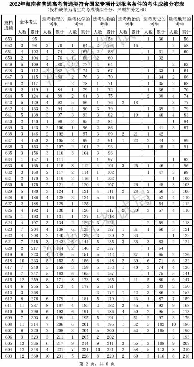 2022年海南高考国家专项计划一分一段统计表及分段排名
