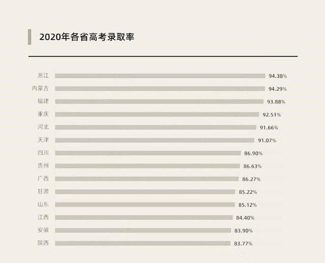 我们来看看部分省市的统计数据,高考录取率浙江达到了94.38%、内蒙古94.29%、福建93.88%、重庆92.51%、河北91.66%、天津91.07%,这是统计出来的录取率超过90%的省市,还有很多省市未统计,比如北京、上海、江苏等国内高等教育最发达的省市,据往年的统计数据显示,上海的录取率最高,本科录取率达到甚至超过了100%,高等教育在这些省市的普及甚至超过了很多教育不发达省市的高中阶段升学率,而它们的高等教育已经普及。