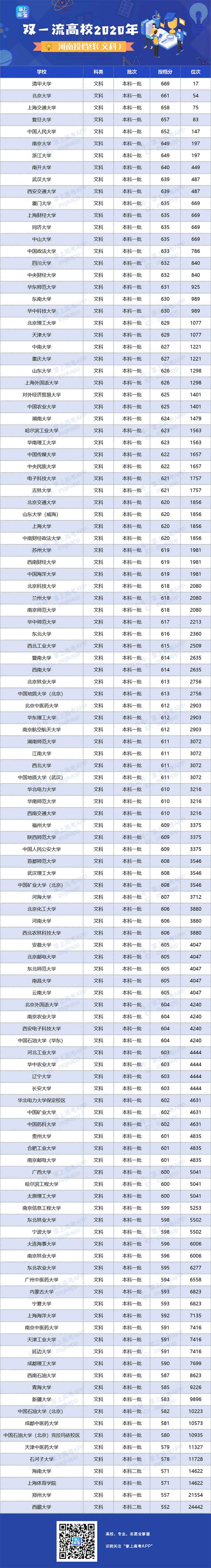 2020年双一流大学在河南投档分数线及位次情况
