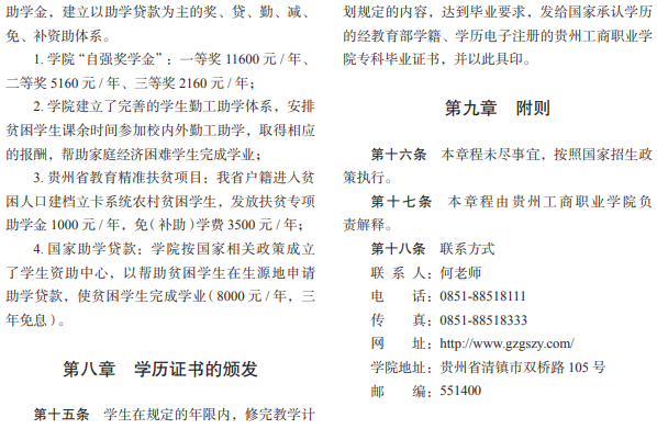 助学金政策:贵州工商职业学院现有下列各项奖、助学金:国家奖学金、国家励志奖学金、国家助学金、学院“自强奖学金”、社会捐资设立的奖助学金,建立以助学贷款为主的奖、贷、勤、减、免、补资助体系。