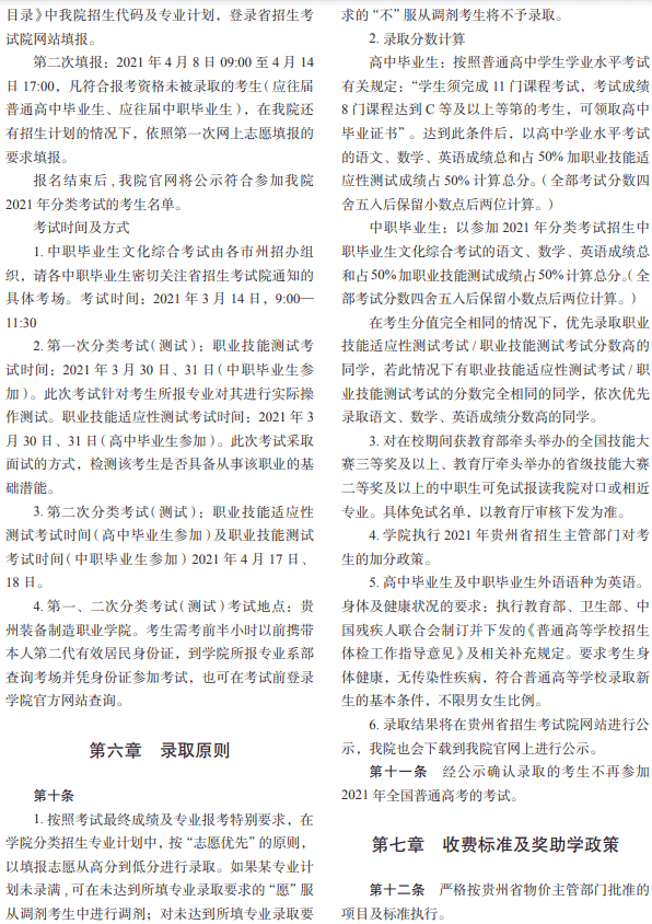 2021贵州装备制造职业学院分类考试招生章程
