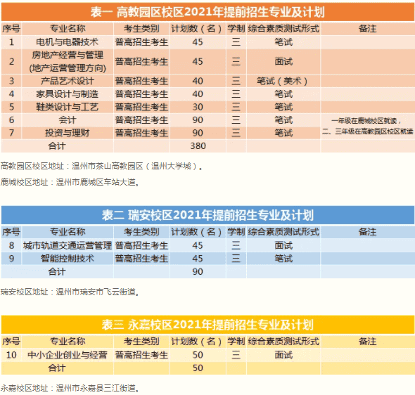 2021年提前招生总计划520名,其中高教园区校区380名,瑞安校区90名,永嘉校区50名。具体招生专业及计划详见表一、表二、表三。