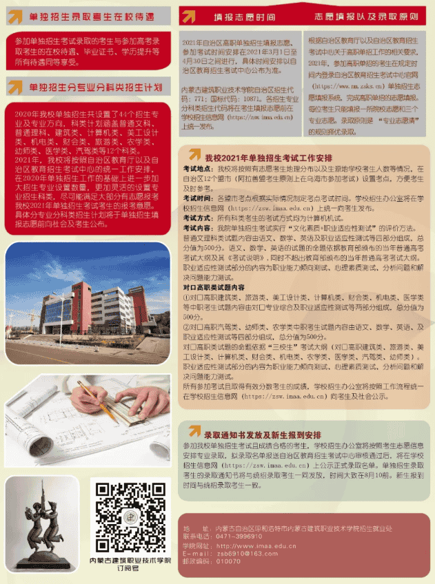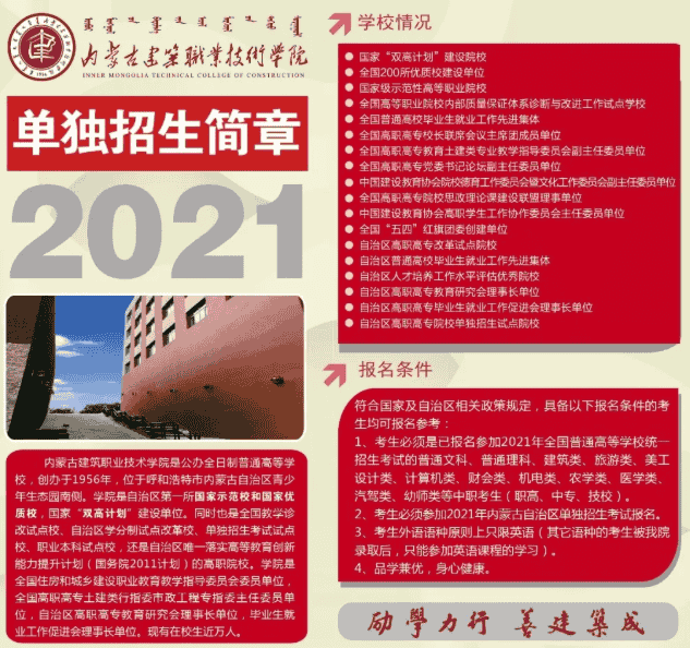 考生参加单独招生考试,若被正式录取,无需参加全国统一高考,未被录取的可继续参加全国统一高考。今天小编就整理了2021年内蒙古建筑职业技术学院单招招生简章相关内容供参考,来看看吧!