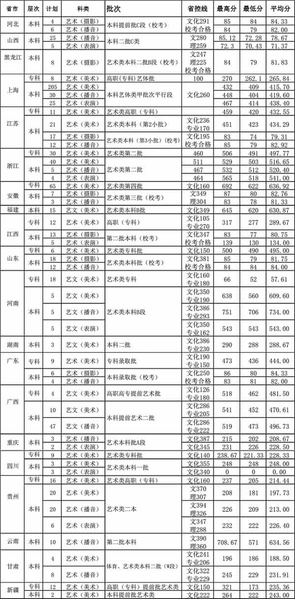 1、对于未组织校考的省份或专业,认可各省级招办组织的艺术类统考成绩(摄影专业认可美术统考成绩),文化课成绩达到各省级招办划定的最低录取资格线,对进档考生按文化课成绩与专业统考成绩之和以分数优先原则,从高分到低分,择优录取。在同分情况下,依次比较文化课成绩总分、外语、语文、数学成绩。平行志愿投档省份按该省投档总分排序,依次录取。