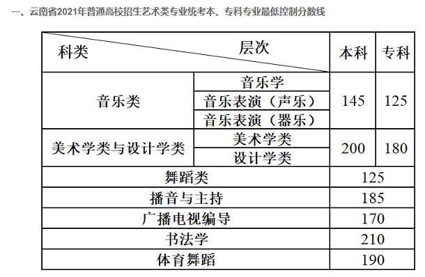 2021年云南省艺术类专业统考合格线 时间:2020-12-29 08:20 分数线 2021年云南省艺术类专业统考合格线已经公布啦!小编为大家整理了相关内容,快来看看吧!2021年云南省艺术类专业统考合格线