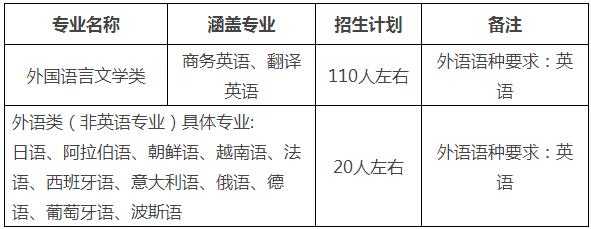 我校2021年外语类保送生招生计划为130人左右(根据生源质量、报考数量和测试成绩等适当调整),招生专业如下: