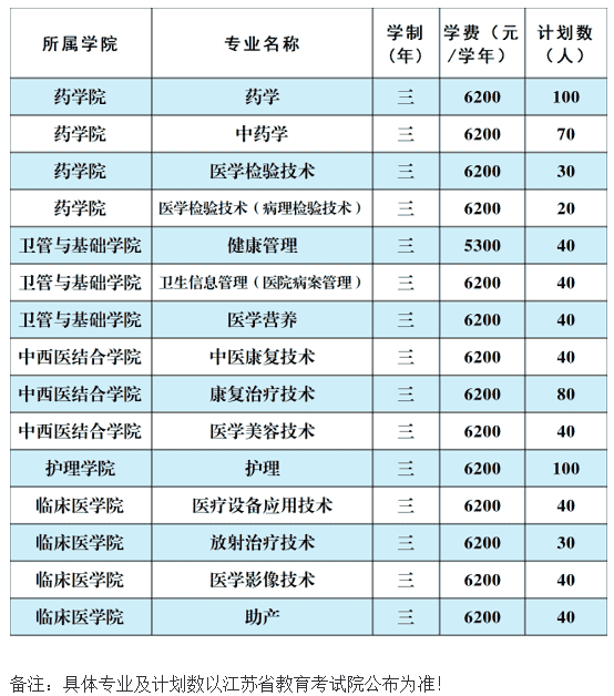 2021年江苏卫生健康职业学院提前招生专业及计划