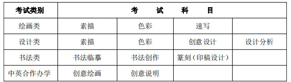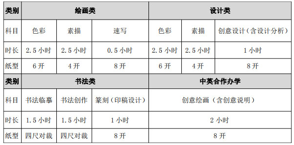 4.绘画类、设计类、书法类专业总分为300分,素描、速写、色彩、创意设计(含设计分析)、书法临摹、书法创作、篆刻(印稿设计)各科满分为100分。中英合作办学专业总分为100分。