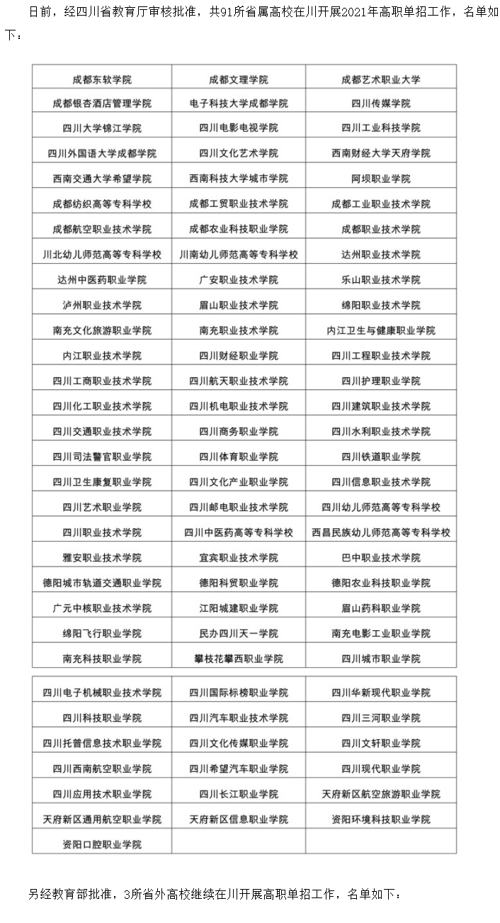 四川省2021年高职单招在川招生高校名单 时间:2021-01-24 09:06 高职单招 四川省2021年高职单招在川招生高校名单公布,小编整理了相关信息,赶快来看一下!四川2021年高职单招在川招生高校名单
