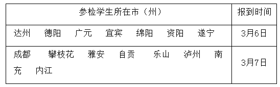 (一)报到时间:3月6日至7日,上午08:30-11:30,下午14:30-17:30,报到1天,检测2天,报到当天不检测;检测为单项淘汰,不合格学生可提前返校。