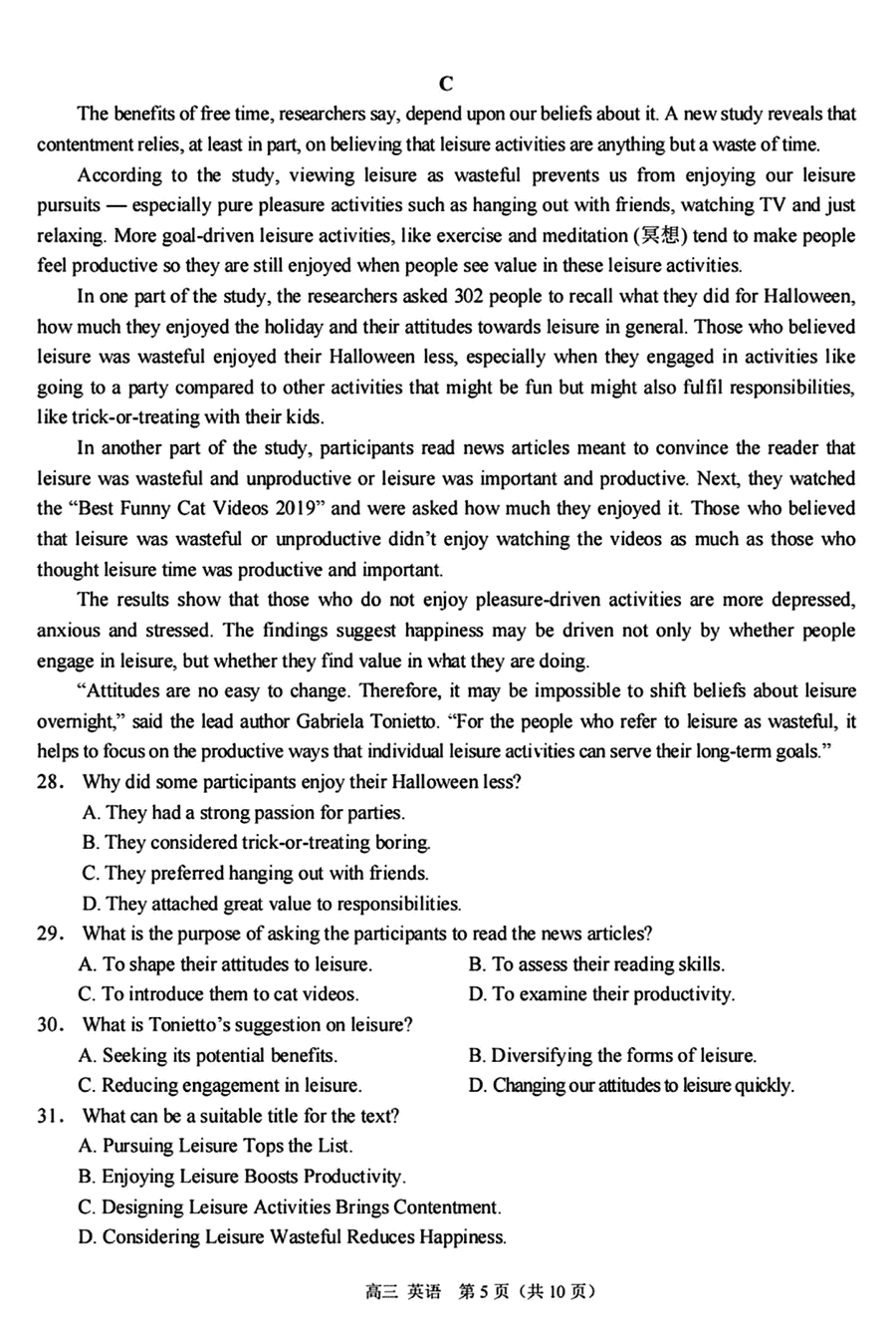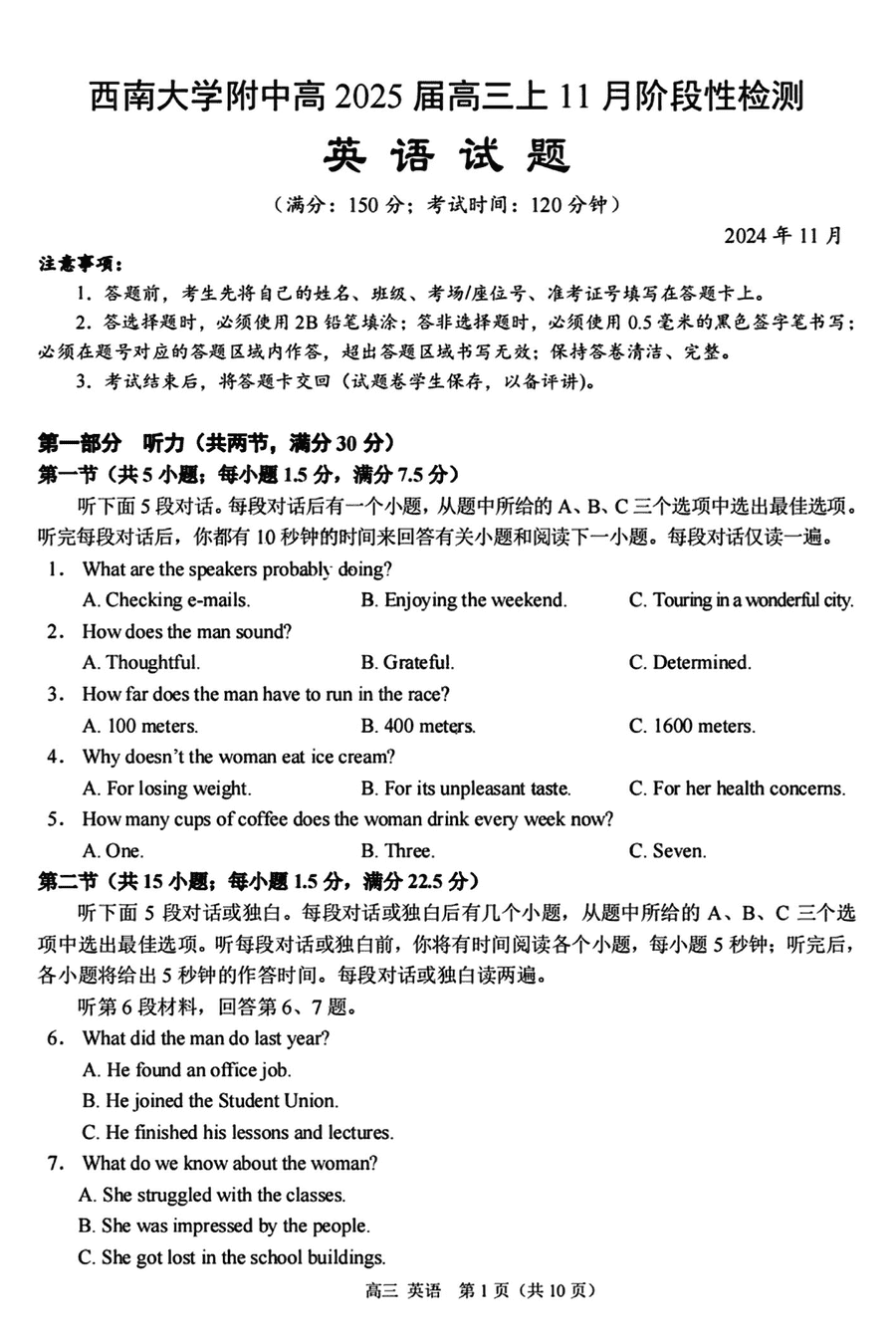 西南大学附中2025届高三上11月阶段性检测英语试题及答案