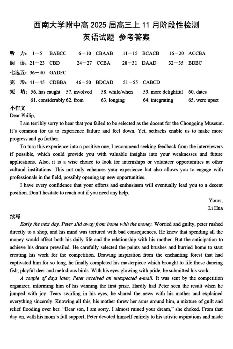 重庆西南大学附中2025届高三上11月阶段性检测英语考试已于近日开考,为方便考生考后及时查看考试情况,查漏补缺、弥补不足,本文整理了试题答案解析相关信息!