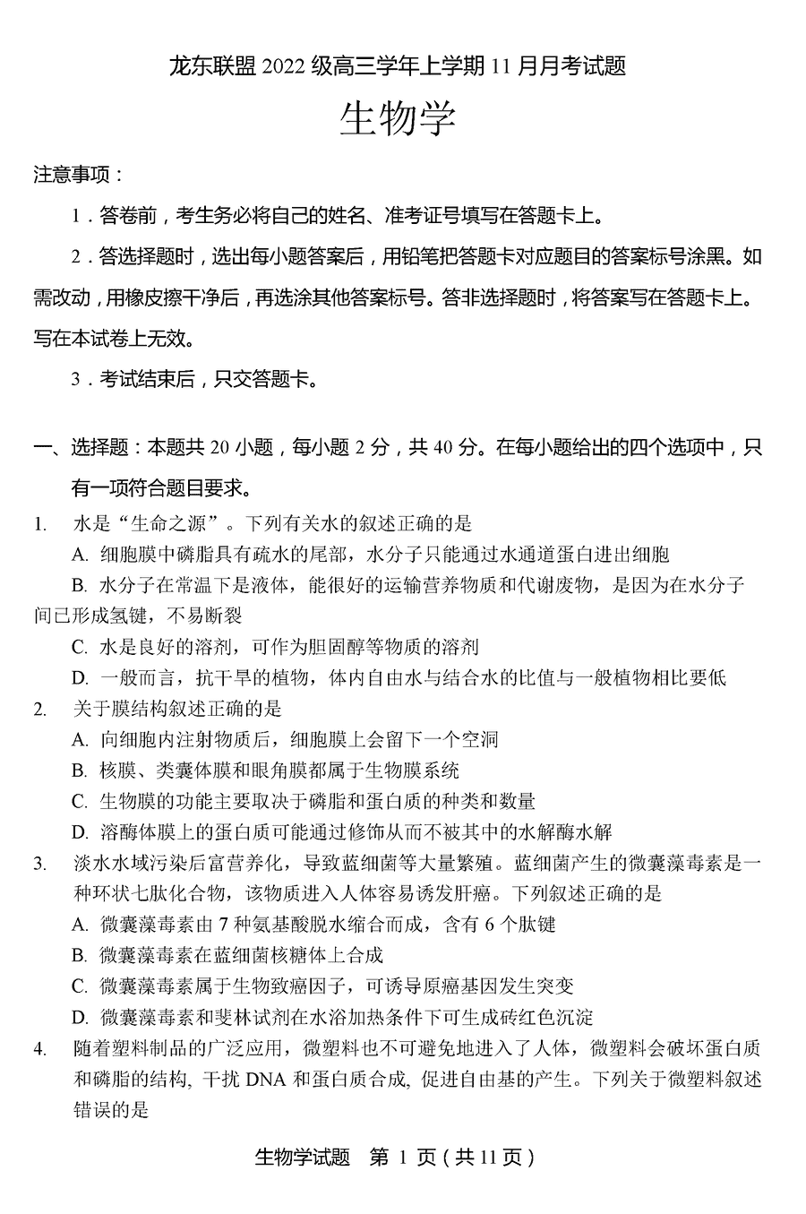 黑龙江龙东联盟2025届高三上学期11月月考生物试题及答案