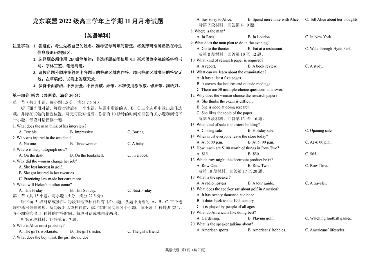 黑龙江龙东联盟2025届高三上学期11月月考英语考试已于近日开考,为方便考生考后及时查看考试情况,查漏补缺、弥补不足,本文整理了试题答案解析相关信息!