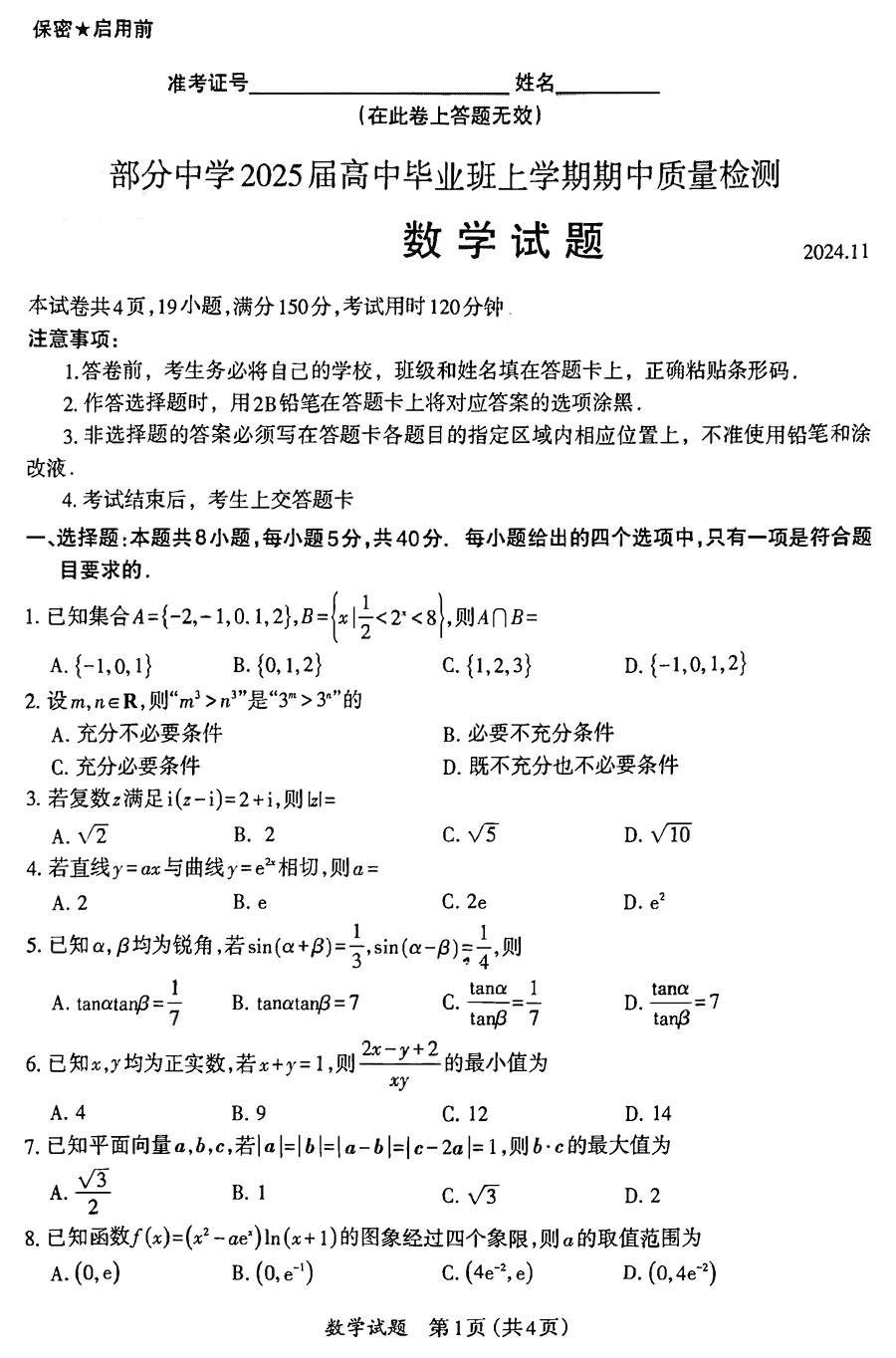 福建名校联考2025届高三11月期中质检数学试题及答案