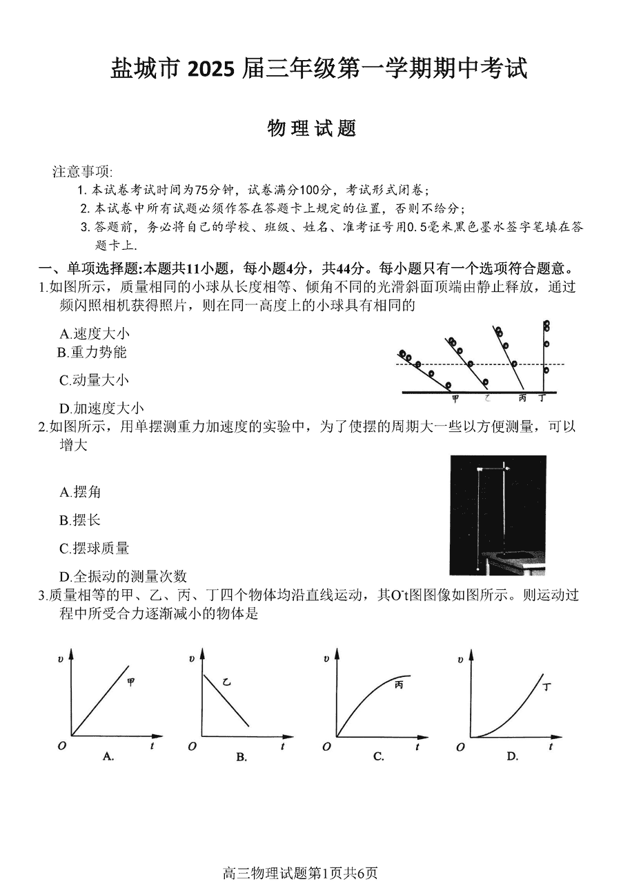 盐城2025届高三上学期11月期中物理试题及答案