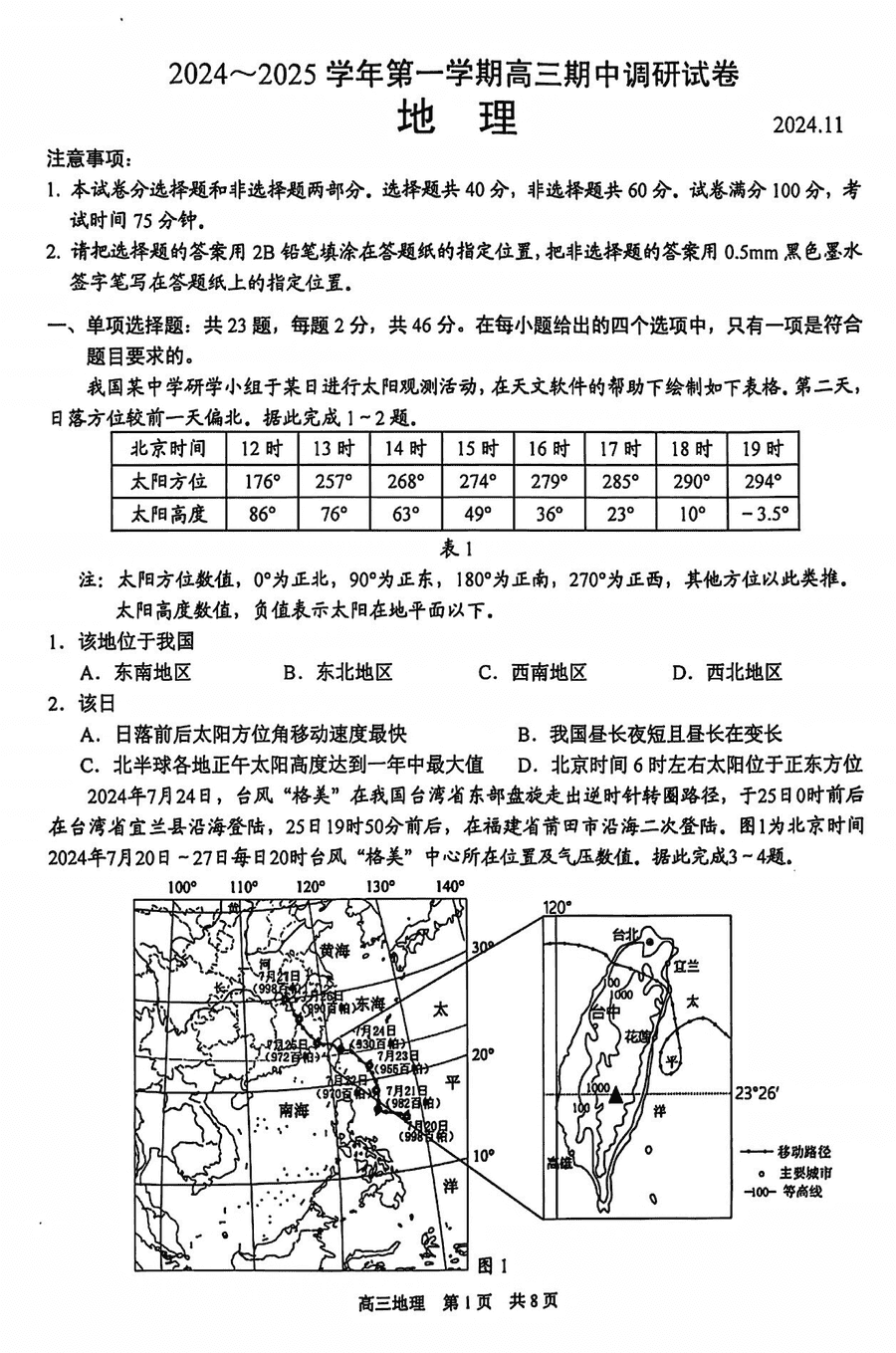 苏州2024-2025学年高三上学期11月期中地理试题及答案