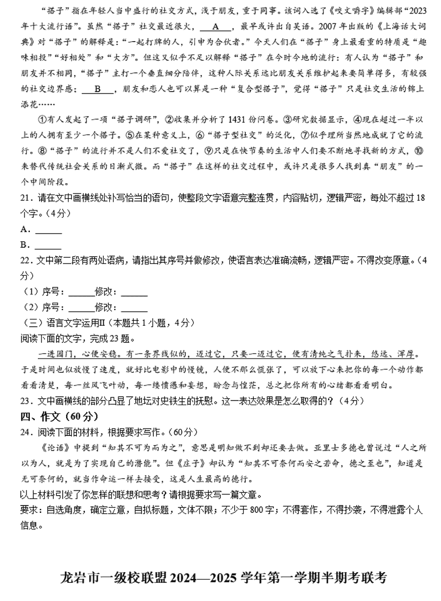 龙岩市一级校联盟2024-2025学年高二上学期11月期中语文考试已于近日开考,为方便考生考后及时查看考试情况,查漏补缺、弥补不足,本文整理了试题答案解析相关信息!