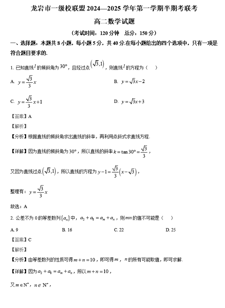 龙岩市一级校联盟2024-2025学年高二上学期11月期中数学考试已于近日开考,为方便考生考后及时查看考试情况,查漏补缺、弥补不足,本文整理了试题答案解析相关信息!